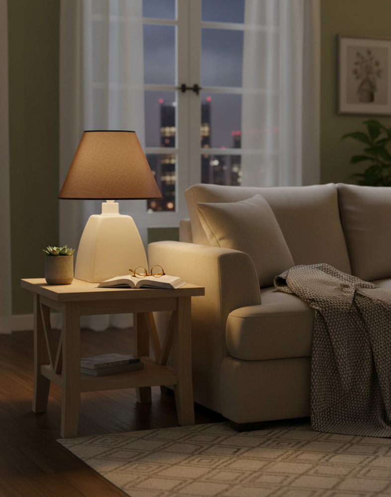 Kızıl Kahve ve Krem tonlarının uyumuyla tasarlanan Dekoratif Kare Prizma Beyaz Abajur AB052, hem klasik hem modern dekorasyonlara uyum sağlayarak yaşam alanınıza estetik bir dokunuş kazandırır.