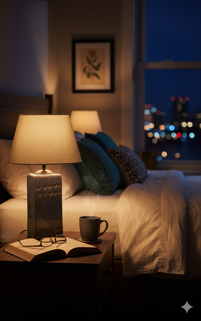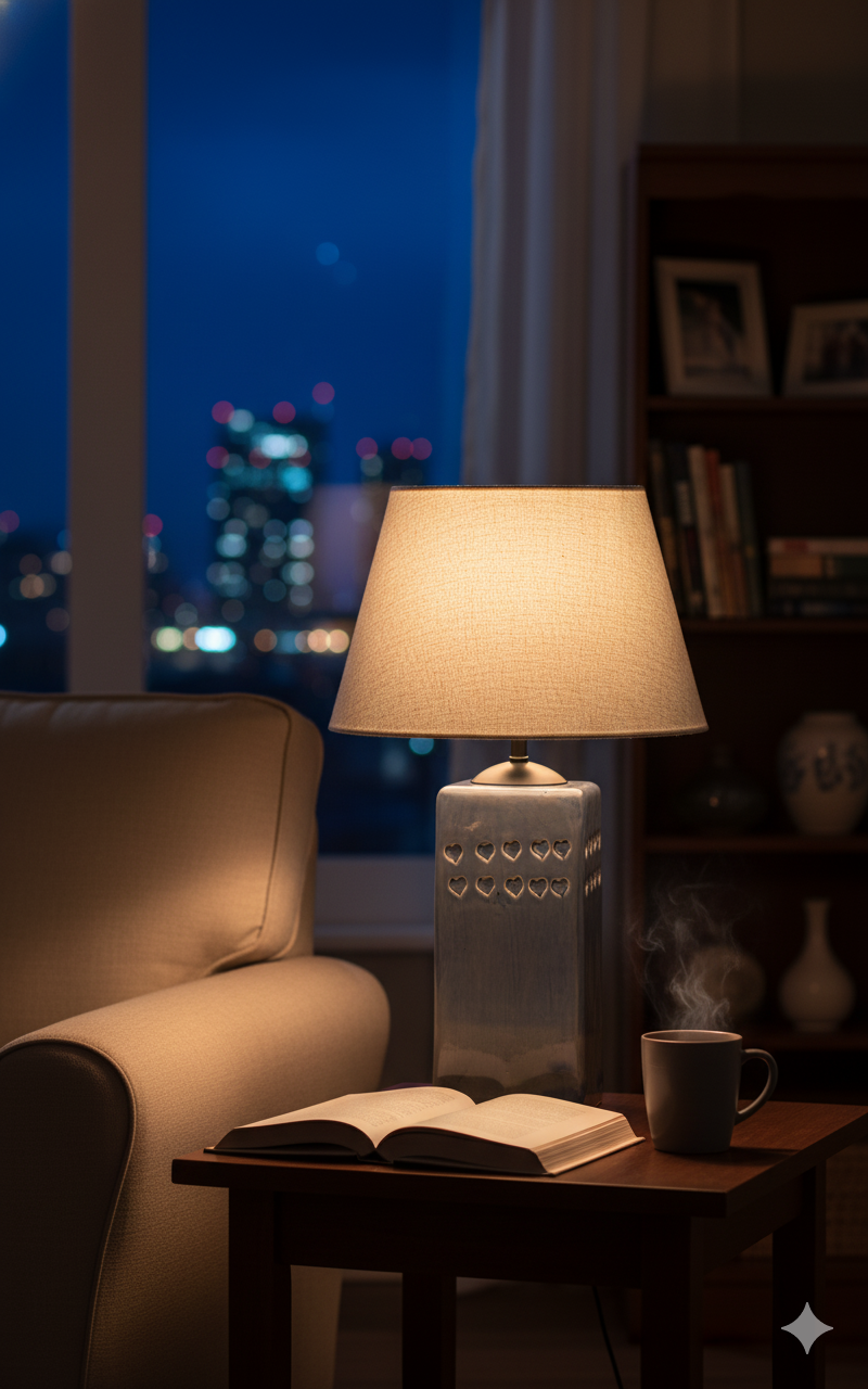 🔸 Kare formdaki abajur başlığı, ışığı dengeli biçimde yayarak ortama yumuşak bir aydınlatma sağlar.