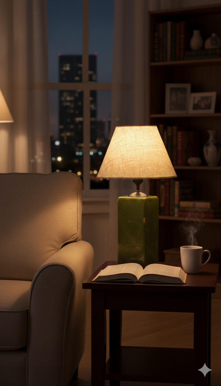 🔸 Kare formdaki abajur başlığı, ışığı dengeli biçimde yayarak ortama yumuşak bir aydınlatma sağlar.