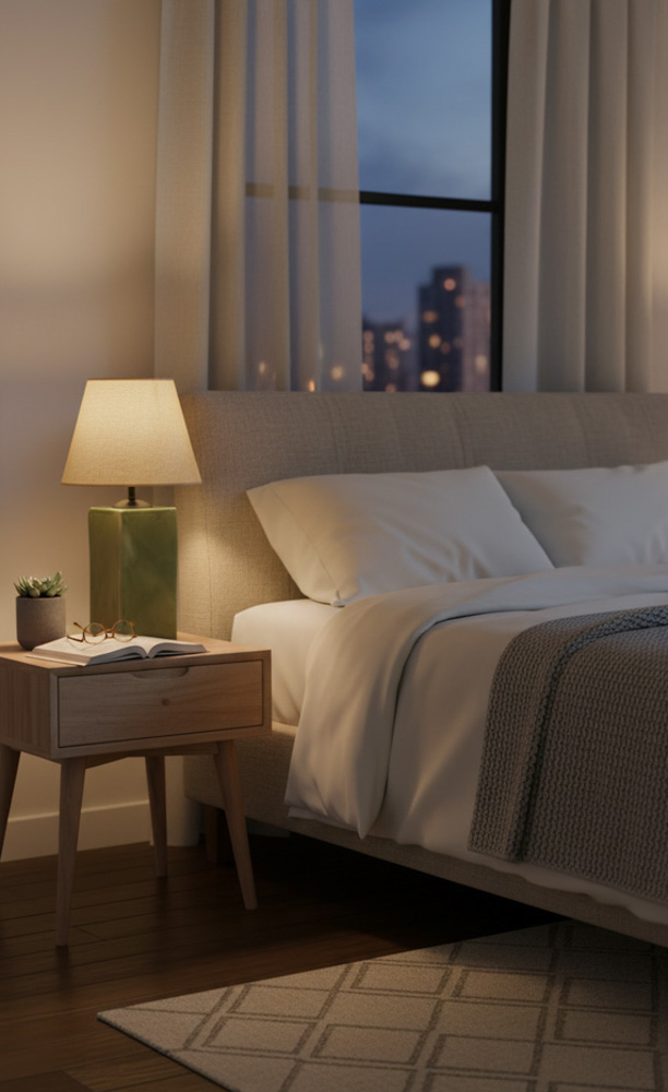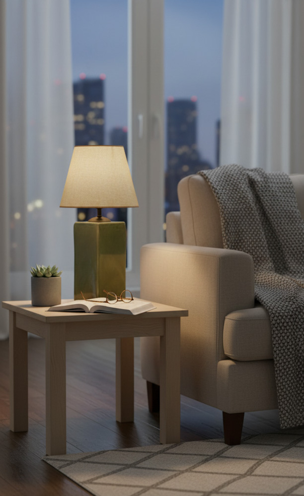 🔸 Kare formdaki abajur başlığı, ışığı dengeli biçimde yayarak ortama yumuşak bir aydınlatma sağlar.