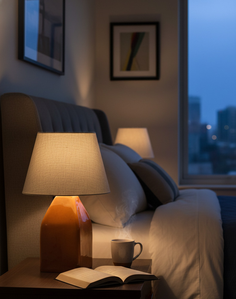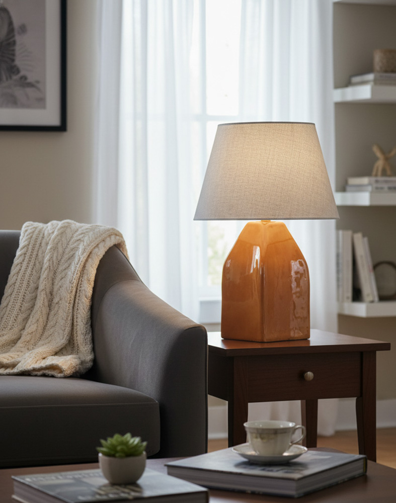 🔸 Kare formdaki abajur başlığı, ışığı dengeli biçimde yayarak ortama yumuşak bir aydınlatma sağlar.