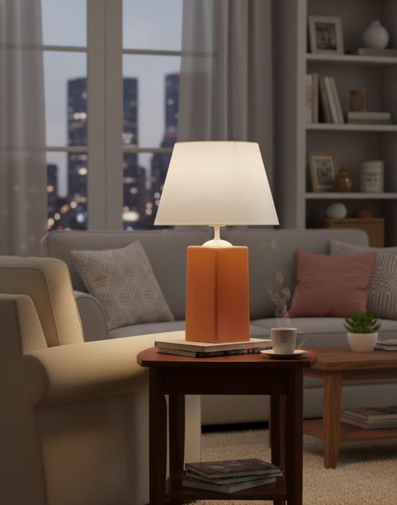 Turuncu ve krem tonlarının uyumuyla tasarlanan Seramik Kare Abajur AB001, hem klasik hem modern dekorasyonlara uyum sağlayarak yaşam alanınıza estetik bir dokunuş kazandırır.